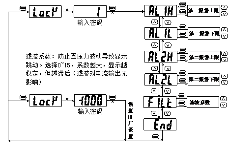Example: To set the switch point 1 as the upper limit alarm output (normally open function) at 4Mpa for suction and below 3.95Mpa for disconnection,; Switch point 2 is the lower limit alarm output (normally closed function) that is disconnected at 10Mpa and sucked below 9.95Mpa: